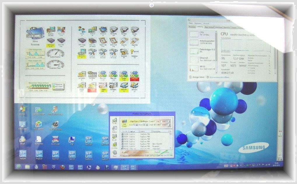 Der Blick auf ein All-In-One-System mit Touchscreen und der Auflösung 1920 x 1080. Bei der hier gezeigten Rasterung von 12 Zeilen und 24 Spalten lassen sich bis zu 288 Objekte bzw. Sensoren aus dem Bereich SAP bzw. PRTG darstellen. Hierbei lassen sich Ihre eigenen Images (Icon's) sowie die Formatierung mit einbinden.
